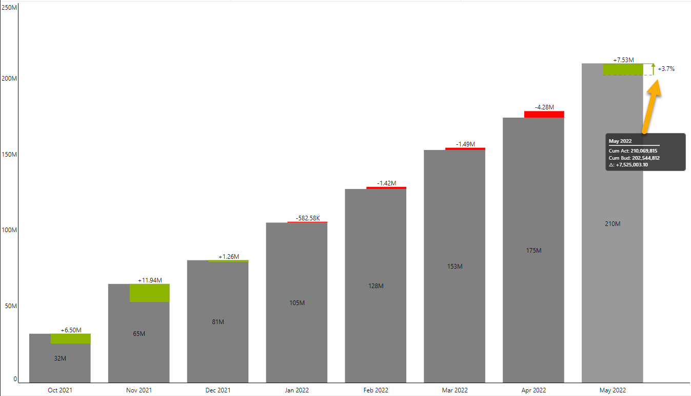 The above chart shows costs for a period of several months, comparing them with the operating budget, which is represented by the gray bars. The cost fluctuates, in some months being greater than the budget, as represented by the red areas on the chart - the green areas represent months when cost was less than budget, The final date point on the chart also displays the % amount by which the cost is less than the budget (orange arrow). Hover over any point on the chart to display the actual cost, the budget, and the difference (delta) between them.