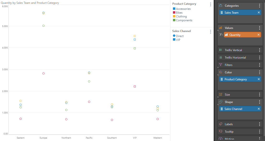 Here, a third hierarchy, Sales Channel, was added to the Shape zone. This hierarchy drives the data point shapes:
