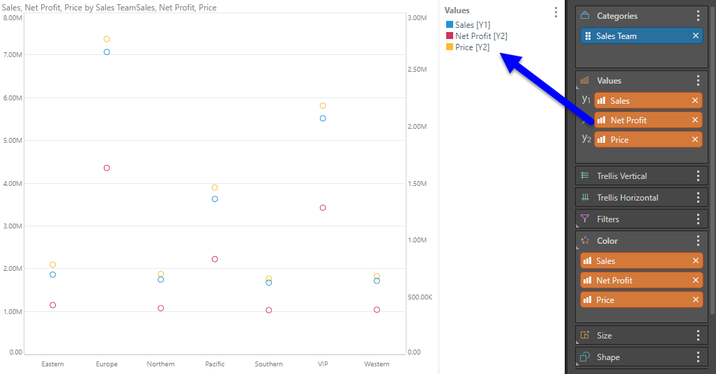 When working with Point charts, you can use the Color and Shape zones to easily construct complex yet sleek charts, that display multiple data points on each category.