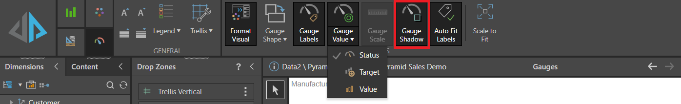 By default, gauges are displayed with a shadow, making it easy to distinguish the tile from the canvas background. Enable or disable gauge shadows by toggling the Gauge Shadow button from the Component ribbon.