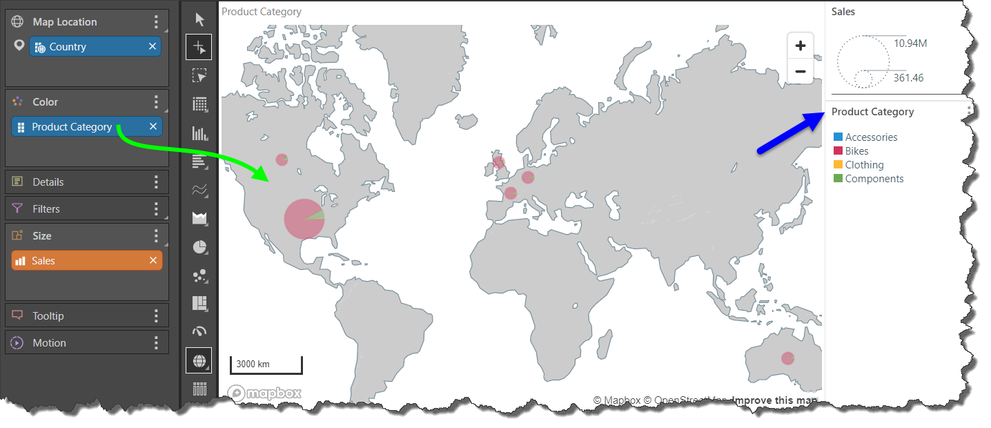 For example, in the screenshot below we see Sales by County, with the Product Category member in color. Each bubble represents that country's product sales, but each bubble is also split into segments representing the proportion of sales for each product category.