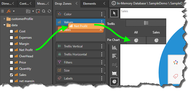 Next, drag a second measure to the Values drop zone and drag it over the Values header to expose the advanced Values sub-menu. Drop the measure in the first column, labeled Pie/ Doughnut Chart and All.