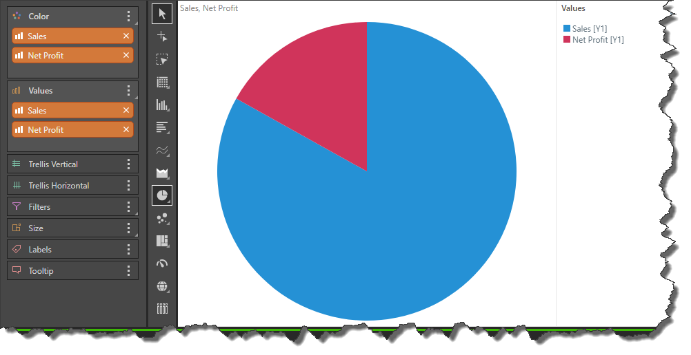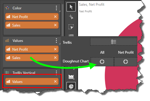 Alternatively, double click or checkbox select the required measure to add it to the Values zone; a Values chip will be generated and added to the Trellis Vertical zone automatically. Open the advanced Values sub-menu and add one of the measures to the All chart column (green arrow) and remove the Values chip from the Trellis zone (red highlight).