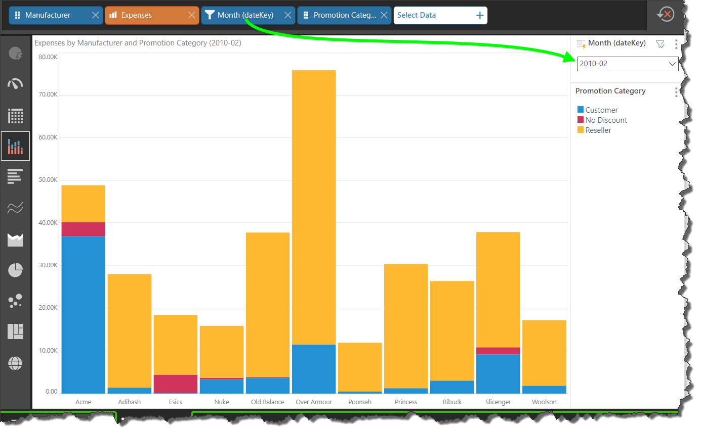 The latter option allows you to filter your visualization by the selected date-time calculation. This is useful if you want your visual to display precise information within a given time-frame. For example, the visual below displays expenses for promotions by manufacturers; adding the full month calculation as a filter enables filtering by specific month, so the user can filter out data from other months: