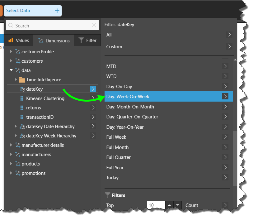 The calculations that are exposed depend on the type of date/ time hierarchy that you select. If you select a dateKey hierarchy, the calculations will be based on days. However, a number of Time Intelligence columns support calculations for other date/ time groupings. If you select the 'full month name' time intelligence hierarchy, the calculations will based on months. Alternatively, select the 'week' hierarchy to choose week-based calculations, the 'quarter' hierarchy to choose quarter-based calculations, or the 'year' hierarchy to choose year-based calculations.