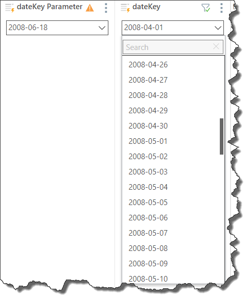 When added from the dateKey hierarchy, a parameter slicer is automatically added to the canvas. The slicer contains a list of all dates in the dateKey hierarchy.