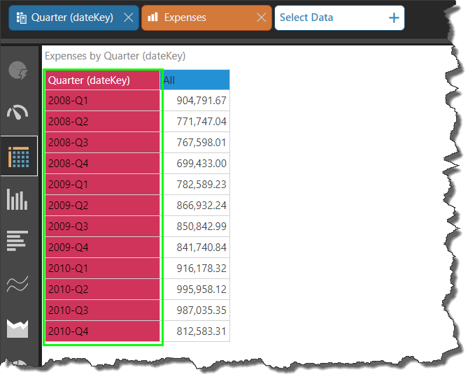 You can add the date part as a hierarchy selection or as a filter selection. When adding the date part as a hierarchy selection (from the Dimensions panel as shown in the image above), all of the date part's elements are added to the visual, as in the grid below. This is a good way to view trends over time, or review a list time periods.