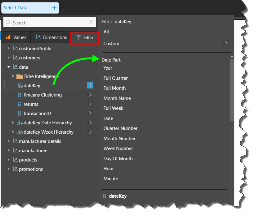 To add a date part as a filter selection, open the dateKey sub-menu from the Filter panel, as shows below.