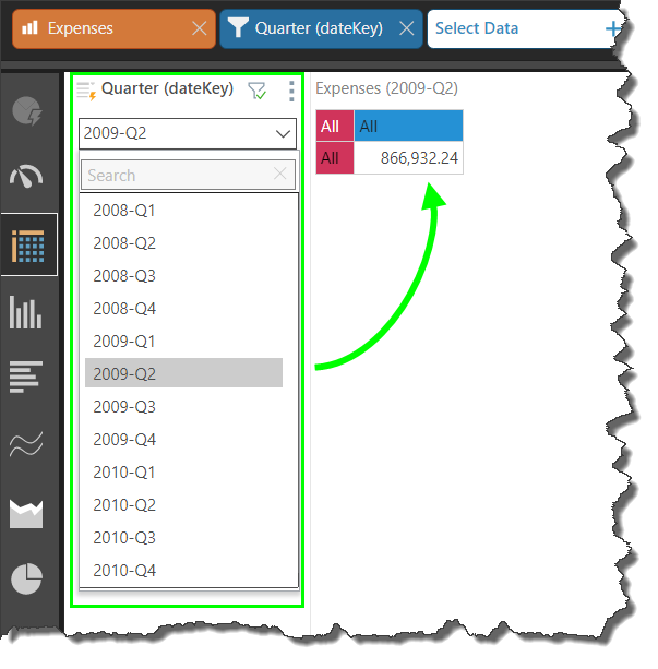 A date part filter selection will add date part's elements to a filter, which will automatically be placed on the canvas. You can then select the exact date or time period by which to filter the query. This is useful if you want to review data for a specified time-frame, rather than produce a trend or list of dates.