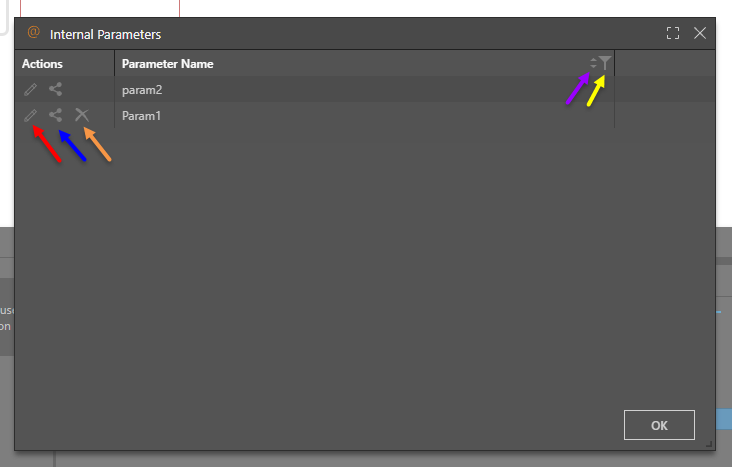 Parameters built in this way are called "quick parameters"; they are "one-off" parameters that exist only in the current query. They can, however, be managed from the Internal Parameters panel. From here, you can edit, share, and delete quick parameters.