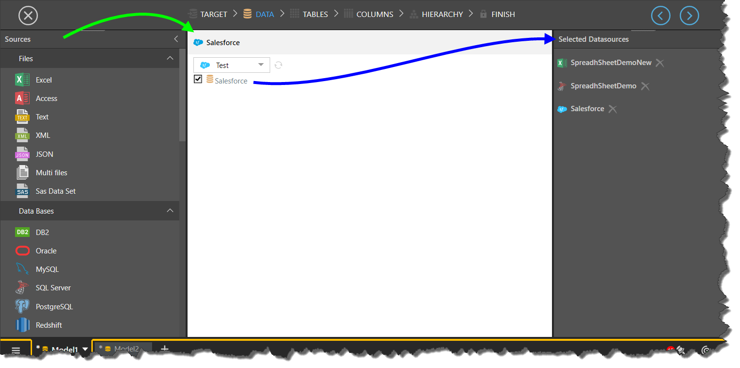 You can connect to multiple datasources and create data mashups, creating a new data model from datasets from different sources. In the example above, for instance, 3 datasources have been selected.