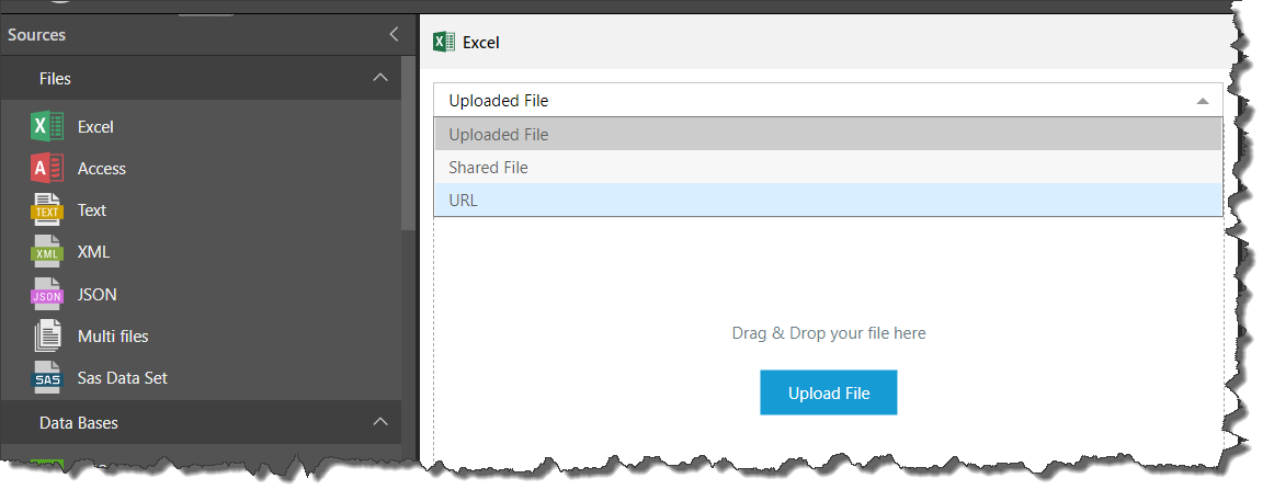 - Excel: upload a file, connect to a shared file, or connect to a URL.