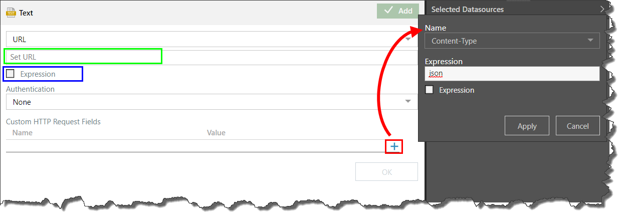 Finally, add any required HTTP request fields (red highlight). In the example below, the request field is set to 'Content-Type', and 'json' was entered in the Expression field, meaning that only JSON content will be returned. Enable the 'Expression' option to write more complex expressions in the PQL editor.