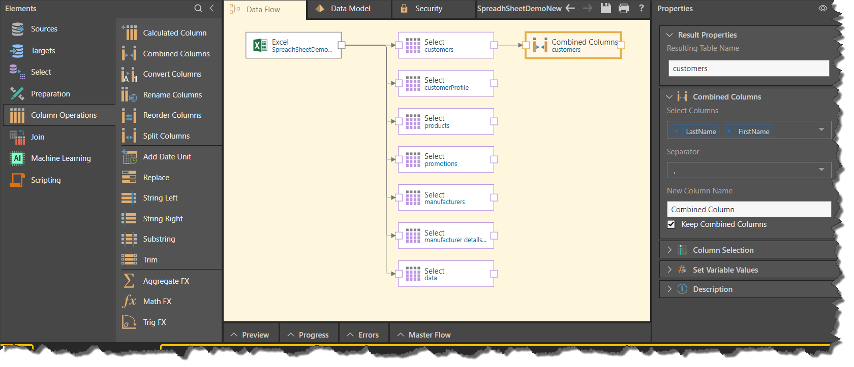 Once connected to the Data Flow, the Column Operations node must be configured from its Properties panel.