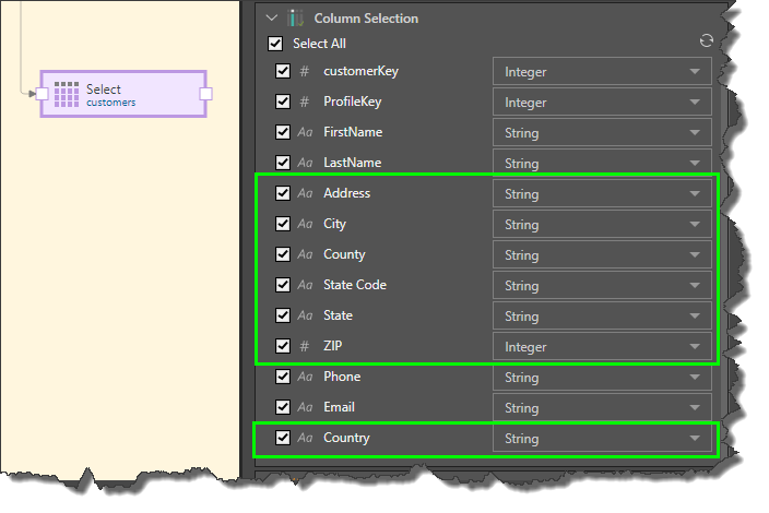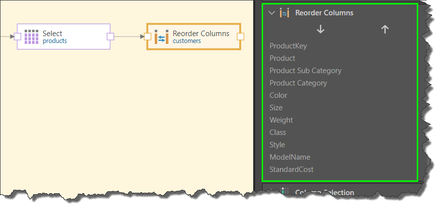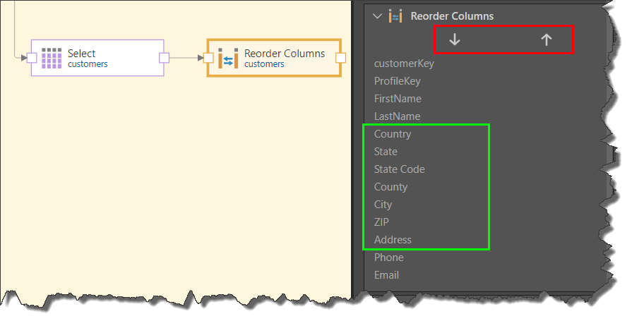 To change the column order, connect the Reorder Columns node to the Select node of the relevant table. Click on the column that you want to move and use the arrows to move it to the desired location (green highlight below):