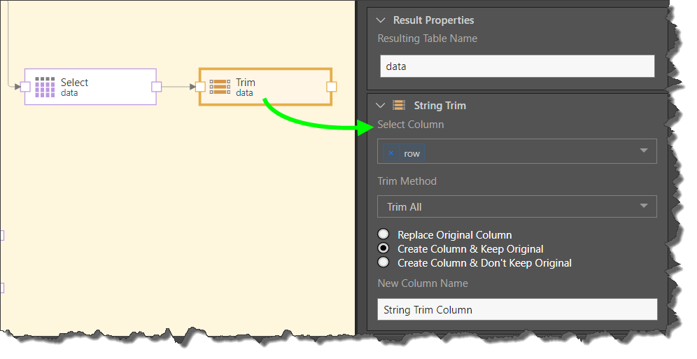 Connect the Trim node to the Select tables of the relevant table. Go to the Properties panel and set the preferences: