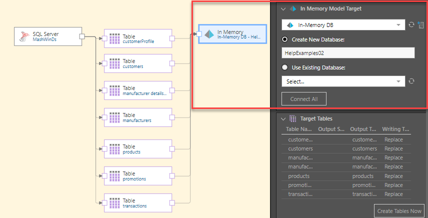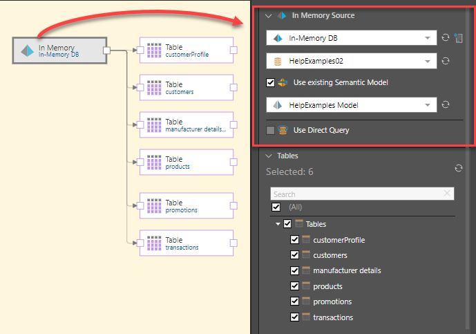 In this example, the Data Flow was loaded into the IMDB, in a new database named HelpExamples02. The semantic model was then defined, and the model was processed as usual, producing a data model called HelpExamples Model.