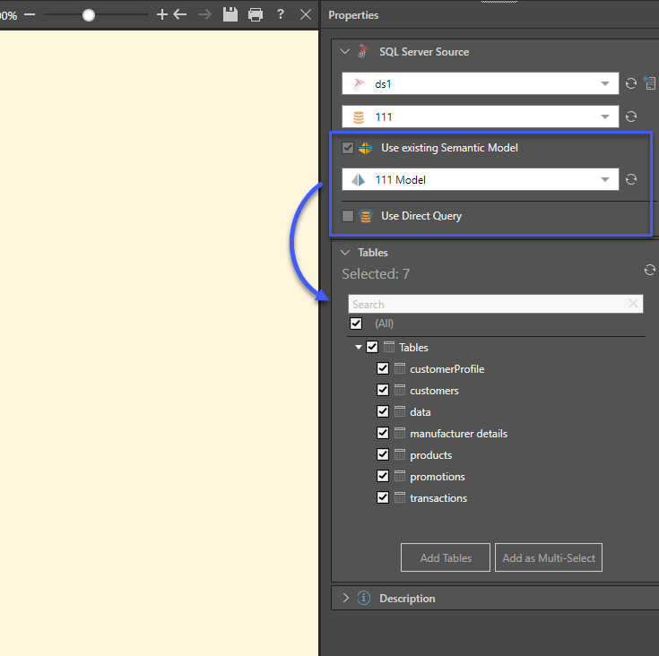 - The tables belonging to this model will be exposed in the Tables panel, where they can be added or removed as needed.