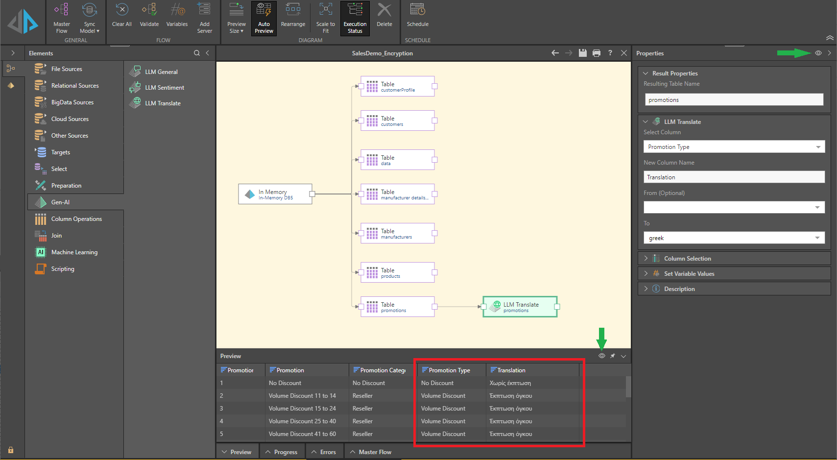 - Click Preview (the two buttons are shown with green arrows in the following example) and check that your translated column is created as you expect in the Preview panel.