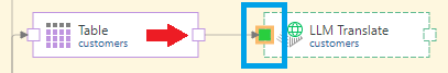 Note: The connection is created by selecting the "end connector" (red arrow) on the Table node and then dragging your cursor to the "start connector" (blue box) on the LLM Translate node.