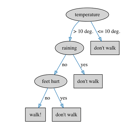 Graphically, this decision tree would look like the following diagram. To make a decision whether to walk to work or not, we start at the top (root) of the tree and consider the question at each interior node (ellipse). The answer to each question determines the branch of the tree to take. Leaves (rectangles) in the tree are the final decisions. Each path from root to leaf can also be thought of as an if-then rule, where the conditions (ellipses) are combined by AND operators.