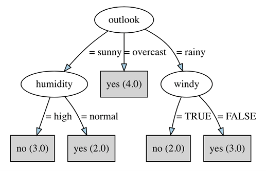 The first thing that we can see from this tree is that outlook is the most important attribute in the data for determining (i.e., deciding) the class label. Note that the attribute chosen at the root of the tree is always the most discriminatory across the entire dataset. In this case, the branch corresponding to outlook=overcast, by itself, accounts for four of the 14 instances in the dataset. The numbers in parentheses show how many training instances reach that leaf in the tree. If there are classification errors (i.e., instances with class labels that differ from the majority class at the leaf), then these are shown as a second number following a slash symbol in the parenthesis. In this tree for the weather data, we can see that every leaf is pure - that is, there are no misclassifications made. Furthermore, the entire dataset can be represented by three of the four attributes: outlook, humidity and windy. Temperature is not needed in order to correctly classify every example. In this way, the tree model can be thought of as a compressed representation of the input data.