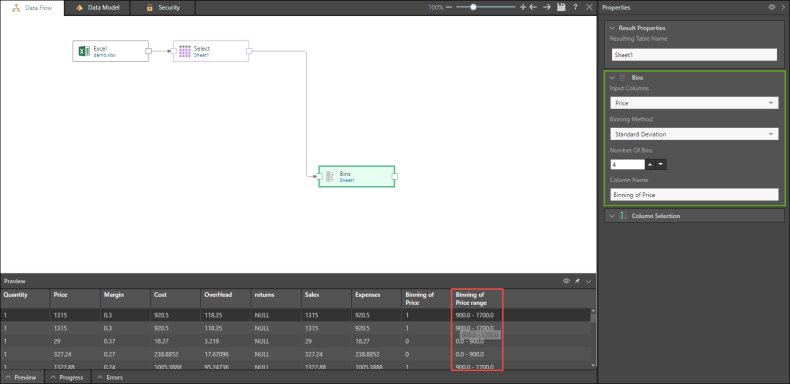In the example below, the given input column is Price, and the chosen method of binning is Standard Deviation, with 4 bins. In the column Binning of Price Range (designated in red), each row is sorted into one of the four bins, based on the Price column.