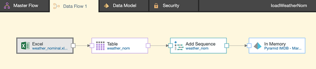 Now let's load this dataset into Pyramid and take a look at the distribution of the class value by various attribute combinations. We can build a new data model based on the weather data in the ETL application like so: