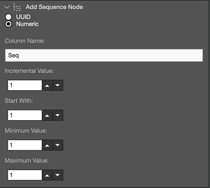 In this case, we've used the Add Sequence node to add a constant value of 1 to each row in the data. We can use this as a measure in the Discovery application when exploring the data. We've configured Add Sequence as shown below: