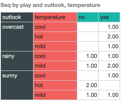 Here we can see counts of the play outcome broken down by outlook and temperature. Note that empty cells indicate that we haven't got an example of that particular combination of outlook and temperature values in our dataset. Things are pretty clear cut when it's overcast - temperature (and the other two attributes) have no bearing, and we always play. It's a mixed bag when it's rainy. In this case, there is a preference to play, but only when temperature is mild. When it's sunny, there is evidence to suggest that we will play when temperature is cool, stronger evidence to suggest that we won't when it's hot, and it could go either way when the temperature is mild.
