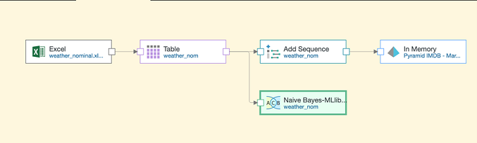 Now we can build a naïve Bayes model to predict the outcome for a new day by training it the weather data. The easiest way to do this is to simply add the Naïve Bayes-MLlib node to our existing data flow, as shown below: