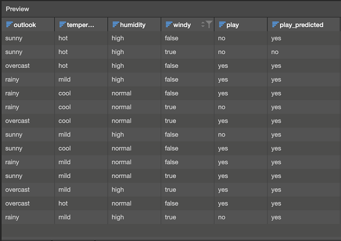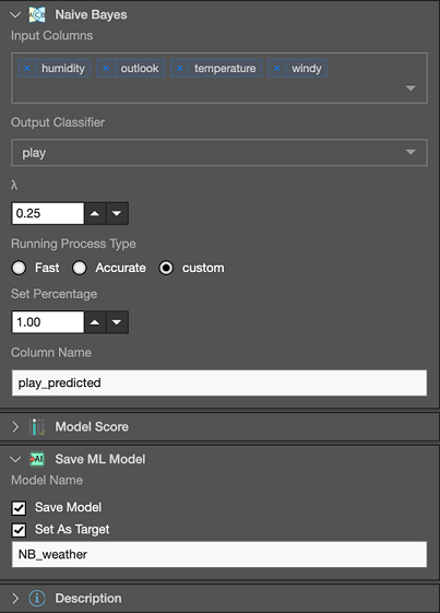 Here we can see that we've selected humidity, outlook, temperature and windy as inputs to naïve Bayes; and play has been selected as the output (i.e., class attribute to predict). Because this is a very small dataset, under Running Process Type we've opted to use all the data to train on. The output will include an additional column containing the predicted class label which, in this case, we've opted to call "play_predicted." Finally, we've chosen to save the naïve Bayes to a file called "NB_weather" so that it can be used in the future to predict on a given day whether it would be suitable for playing or not.