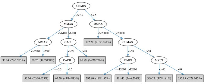 As was the case with the classification tree, the importance of attributes with respect to predicting the target is reflected in the level at which they are tested within the tree. So, in this case, the regression tree algorithm has chosen the CHMIN as the most predictive attribute with which to segment the data at the root. The next most important attribute - MMAX - is tested on both branches at the second layer of the tree. At the leaves of the tree (shaded rectangles) there are several pieces of information shown. The first number is the average of the target (PRP) values that reach the leaf in question. The first number in parentheses, to the left of the "/", is the number of training instances that reach the leaf in question; the second number is the percentage reduction in variance of the target values at the leaf, compared to that of the whole training set.