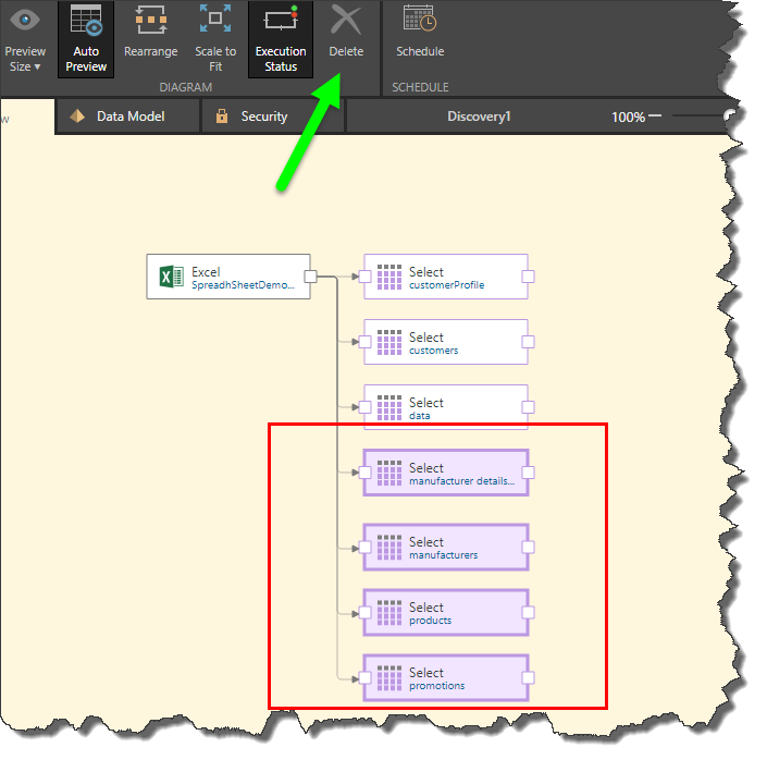 The selected nodes will be highlighted (red box below), and can then be moved as a group or deleted (green arrow).