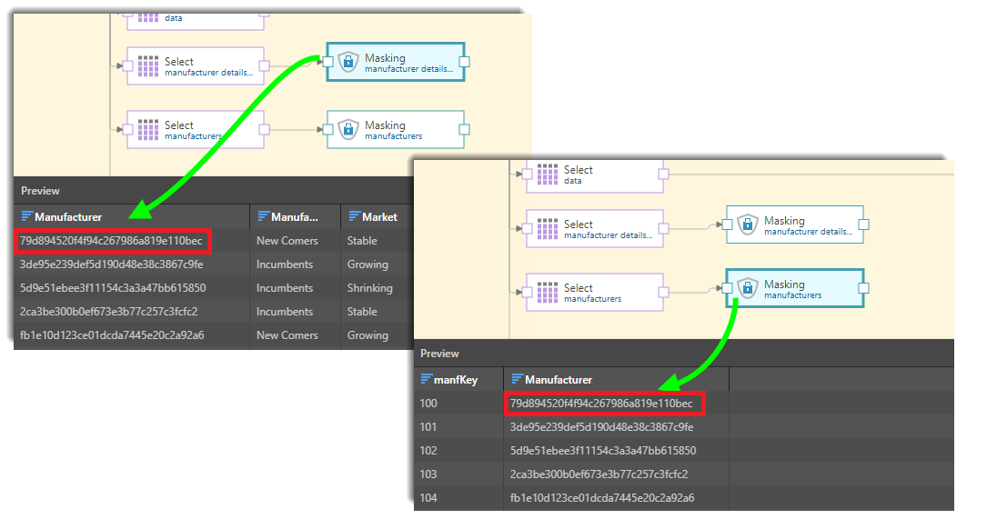 When the Masking function is applied to the Manufacturer column in both of these tables, each distinct manufacturer is assigned the same mask string in both tables: