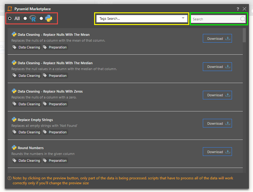 The Pyramid Marketplace is a catalog of Python and R scripts that can be downloaded and run immediately. There is a variety of scripts, ranging from data cleansing to stocks and finance, to machine learning, and more.