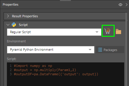 Access the Marketplace from a Python or R node by clicking the shopping cart icon from the Properties panel (green highlight below):