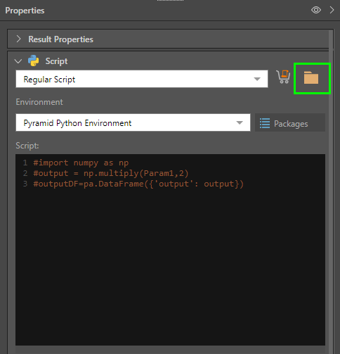 To inject a shared script to a Python or R scripting node, click the file icon (green highlight below) from the node's Properties.