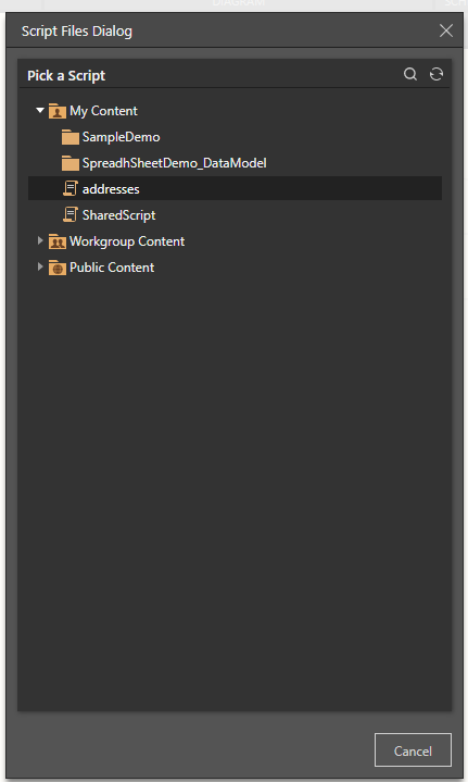 The Script File Dialog will open; from here, navigate the folder tree to locate the required script. Only shared scripts in the same language as the scripting node, and to which you have access, will appear.