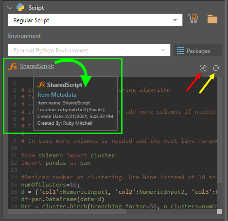 - Item Metadata: the Formulate icon will appear beside a hyperlink to the script. Hover over this expose the Item Metadata pop-up, which shows the script name, location in the content manager, create date, and user who created it (green highlight below). Click the hyperlink to open the script in Formulate; depending on the permissions you have for the script, you may be able to edit it.