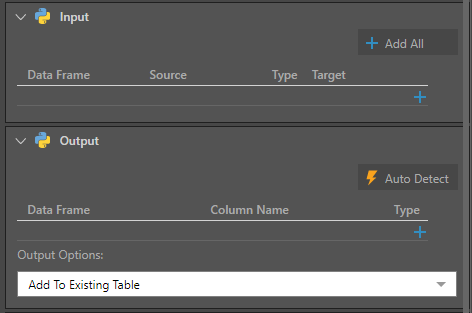 Inputs and Outputs may or may not have been configured for the script in Formulate; if they were configured, they will be loaded into the Input and Output windows in Model.