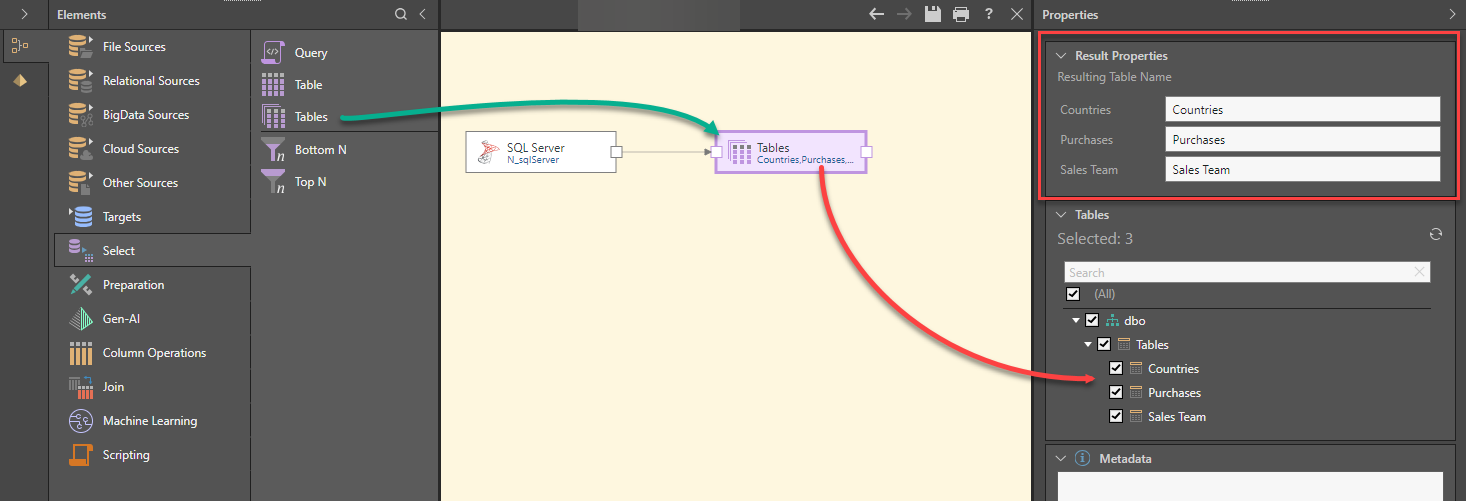 To edit the Tables node, go to its Properties panel and choose which tables to copy (red arrow above). You can also rename the tables as required (red highlight).