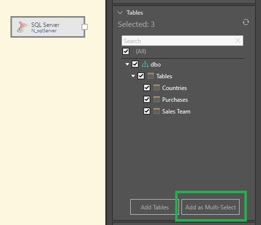 The first method is to add the required tables as a Tables node from the Properties panel of the data source: Select the source node and click Add as Multi-Select (green highlight below):