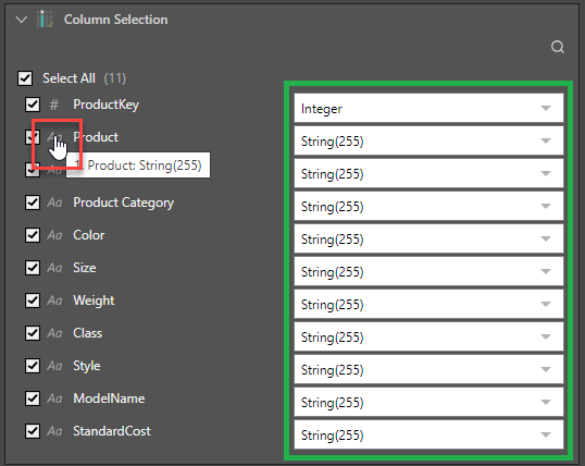 - Data Type mapping: Type or select your required data type using this combo box (green highlight). Updating this value changes the data type for the selected column before it is passed on to the next node or the target. This mapping option is typically only relevant for file sources.