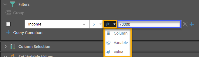 - Select the type (orange box below) for the second operand. This can be one of column, variable, or value.