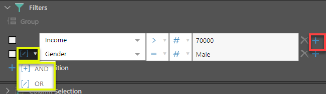 - Select AND or OR (yellow box) to determine how the two conditions should be joined.