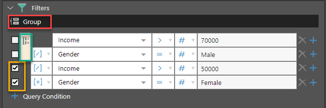 - If multiple conditions are required, click on the "+" sign (red box below) to add an additional query condition.