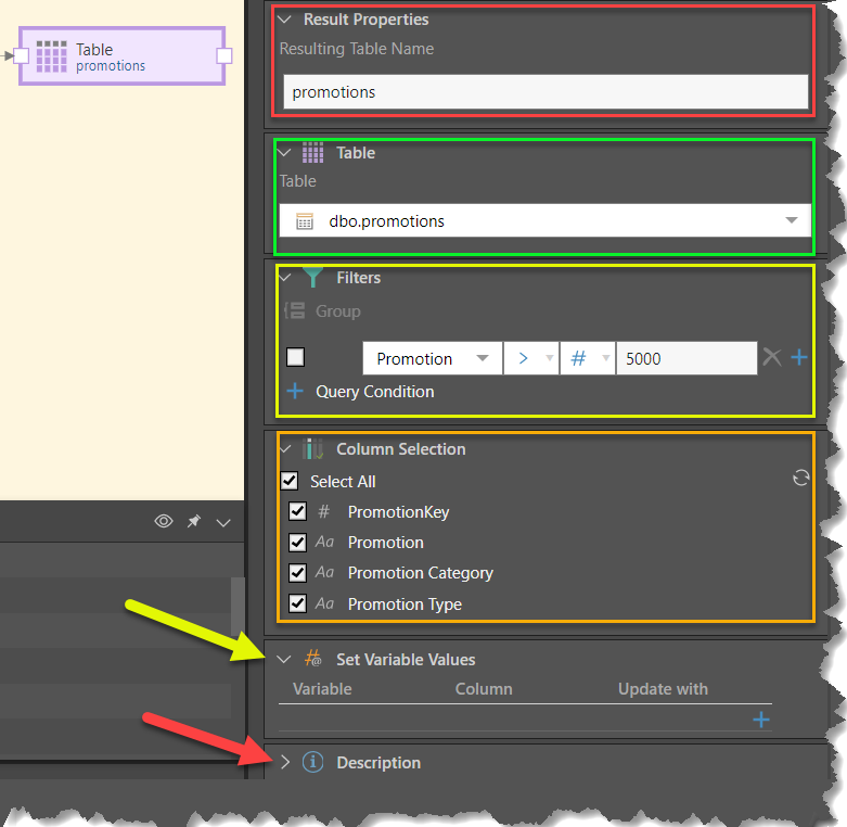 You can rename the table (red box below), change the table selection (green box), change the filter selection (yellow box) change the column selection (orange box), set incremental loading via a variable, (yellow arrow), and add a description (red arrow) that will be visible only in the Model app.