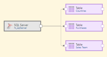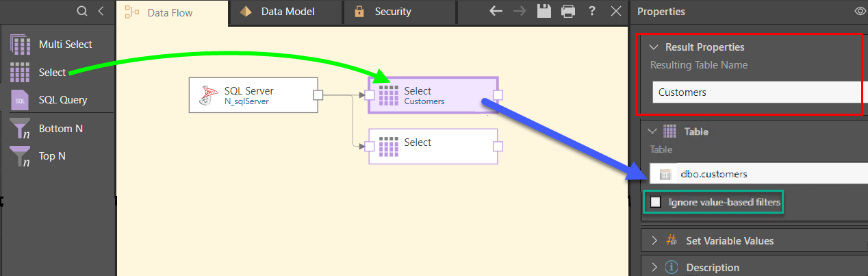 The second method requires you to add each Table node individually, connecting them to the data source node (green arrow below), and to then inject the relevant table (blue arrow) into each Table node from the Properties panel. You can also rename the table from each node (red highlight).