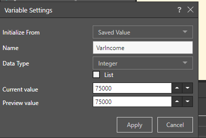 To accomplish this, a variable is created named VarIncome, where the value is set to 75000: